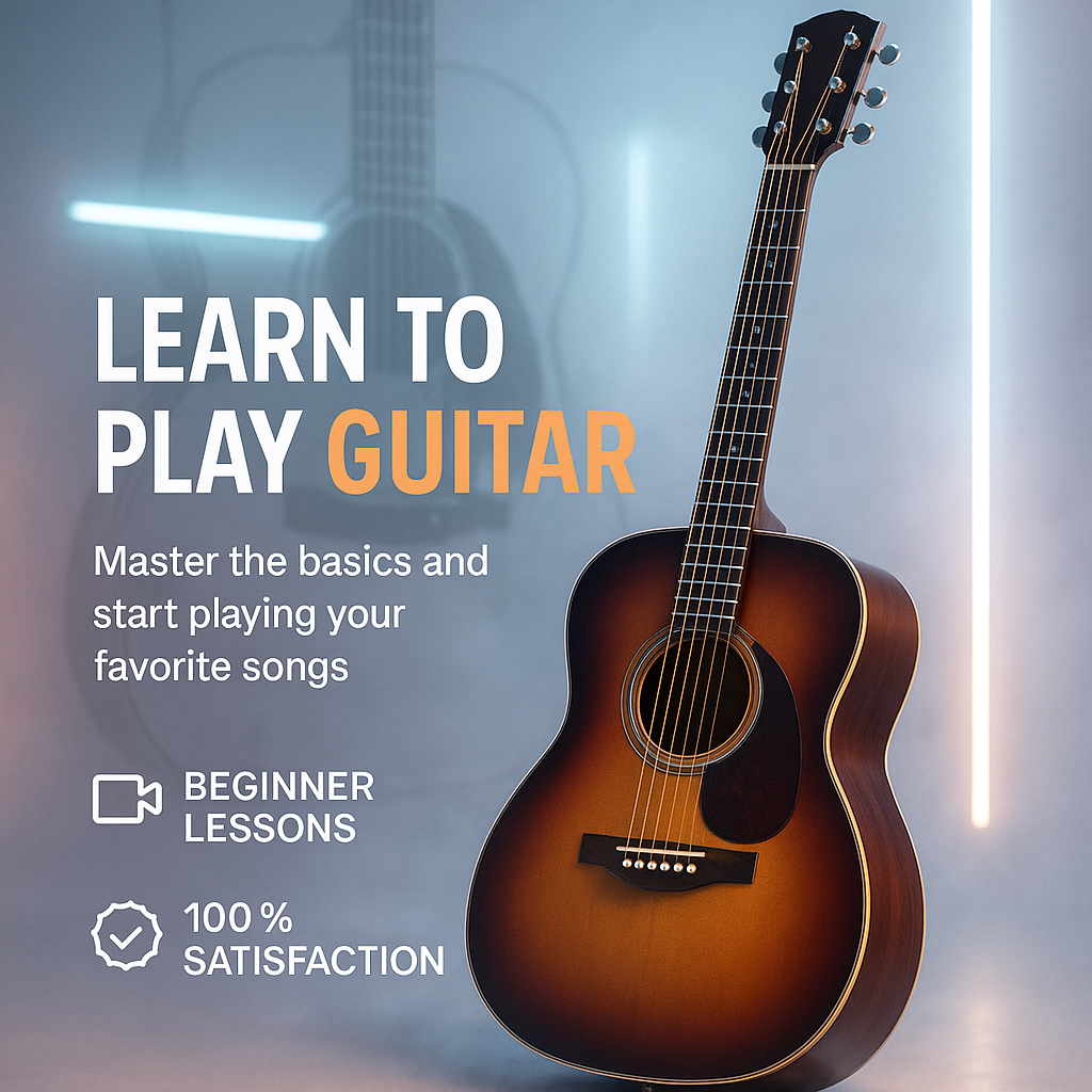 Promotional graphic for guitar lessons featuring an acoustic guitar in a stylish setting, designed to attract beginner musicians with a modern aesthetic.
