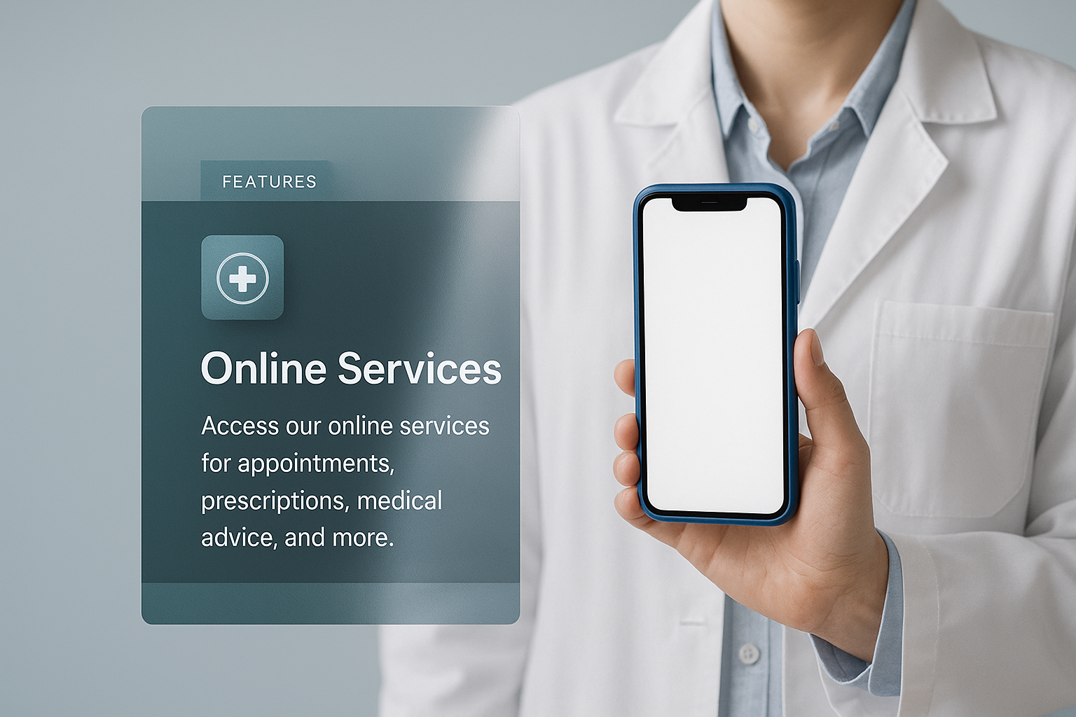 /Collection: /by davooda/Type: PNG/A pharmacist in a white coat holds a smartphone displaying a blank screen. The background features a soft gradient, integrating design elements for online medical services.