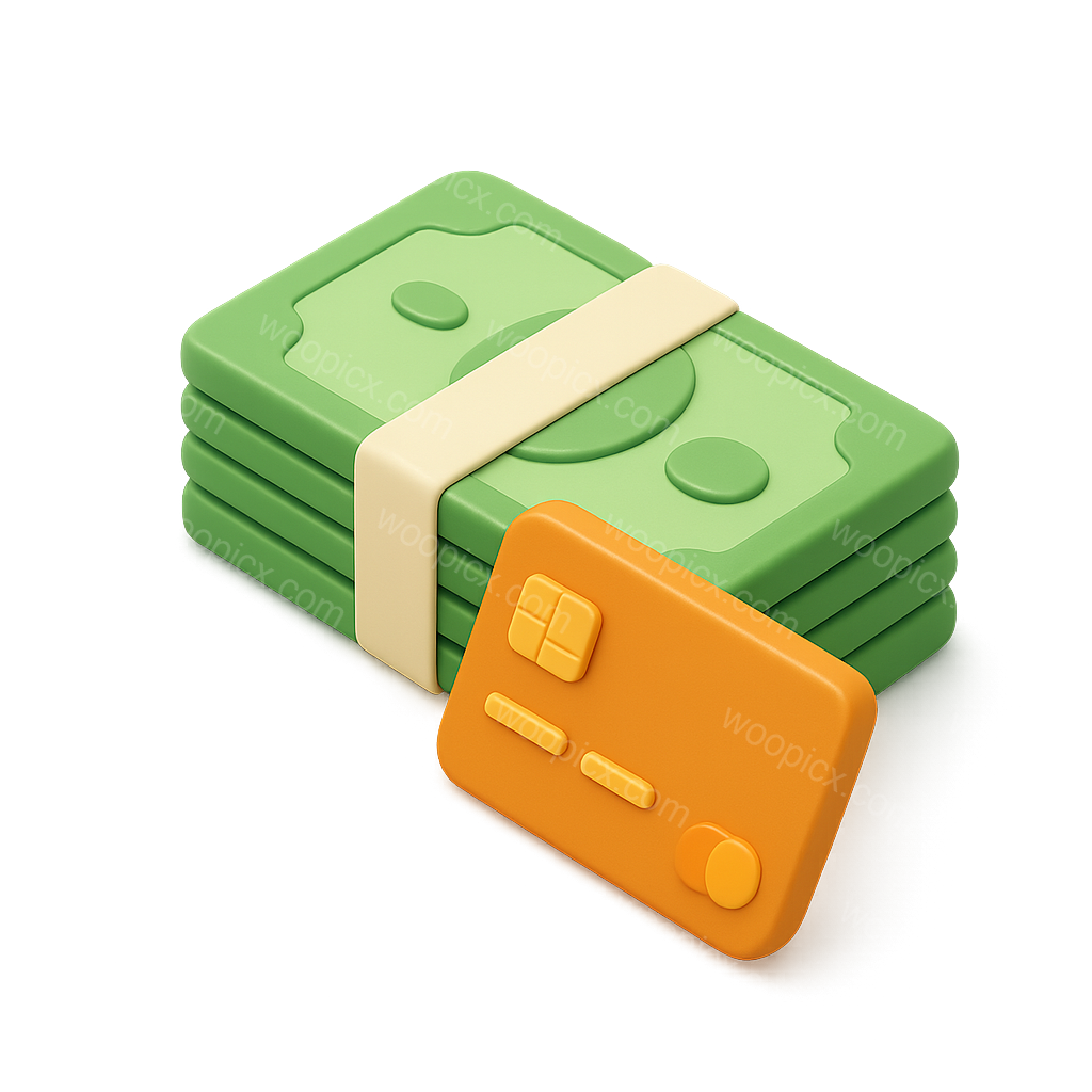 A visually appealing 3D representation of banknotes stacked with a credit card beside it. The design features vibrant colors and a smooth, isometric style for a modern feel.