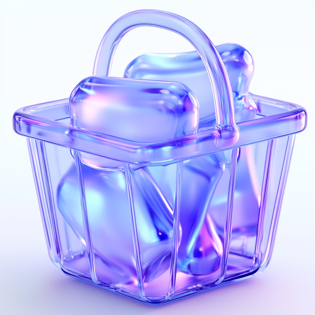 /Collection: /by davooda/Type: PNG/A 3D-rendered image of a transparent basket filled with colorful gummy candies. The design features vibrant hues of blue and purple, creating a modern and playful aesthetic, suitable for candy-related marketing or packaging.