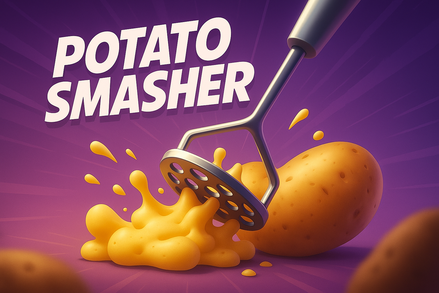/Collection: /by davooda/Type: PNG/Vibrant illustration featuring a potato smasher in action, with splashes of mashed potato. The dynamic background and bold text create an engaging visual experience.