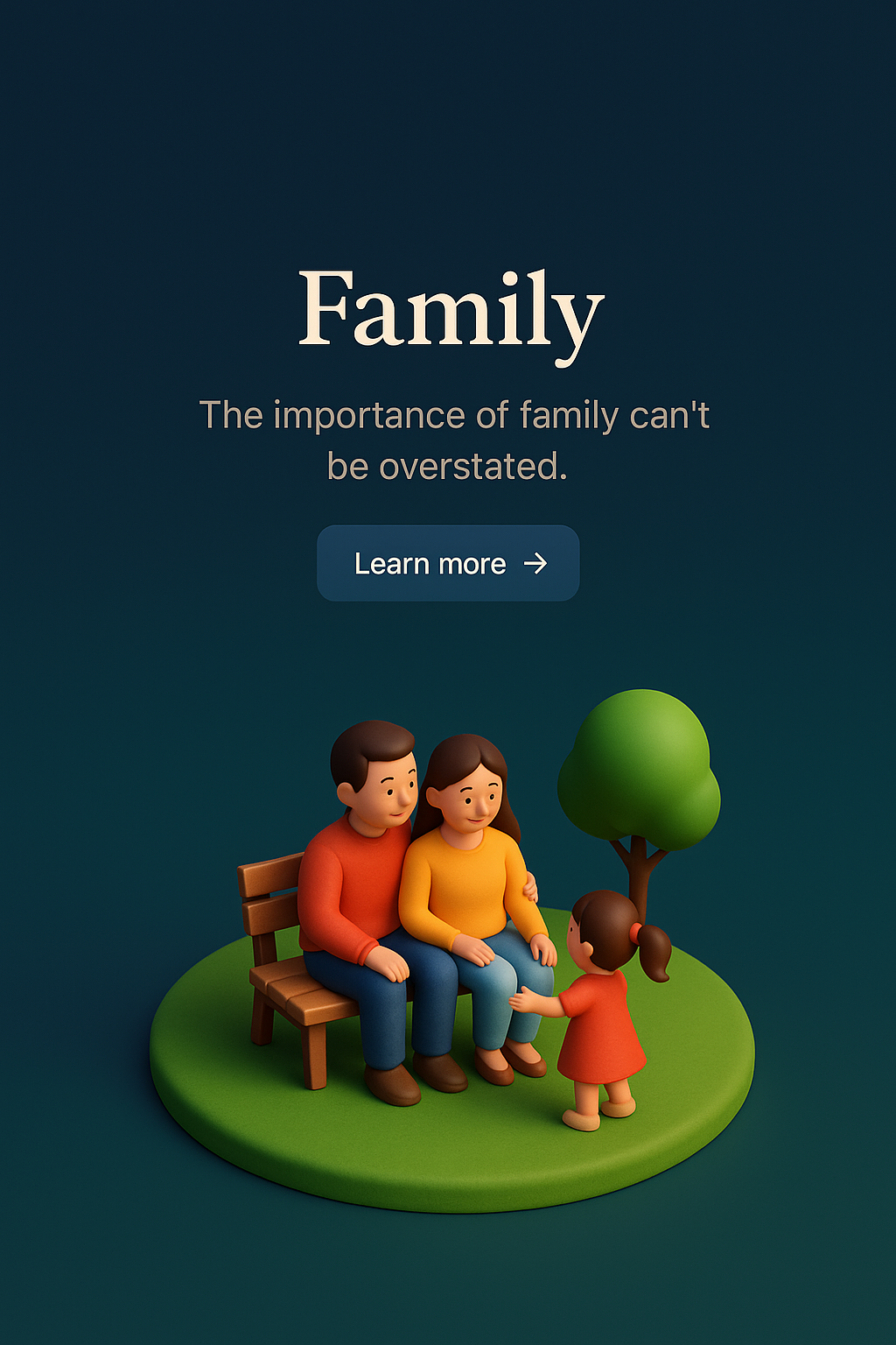 A charming 3D scene depicting a family sitting on a bench, surrounded by a simple environment. The dark gradient background enhances the focus on the family, promoting the theme of togetherness.