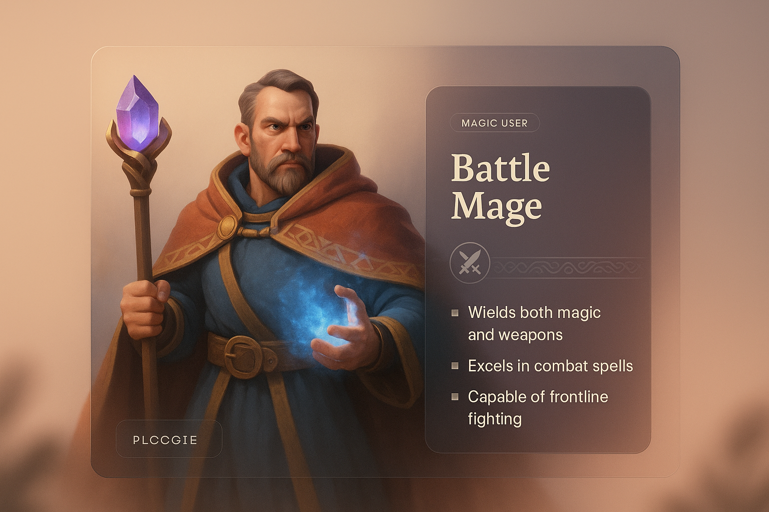 /Collection: /by davooda/Type: PNG/A detailed 3D illustration of a battle mage, holding a glowing staff and surrounded by magical elements, featuring a soft gradient background and integrated text box.