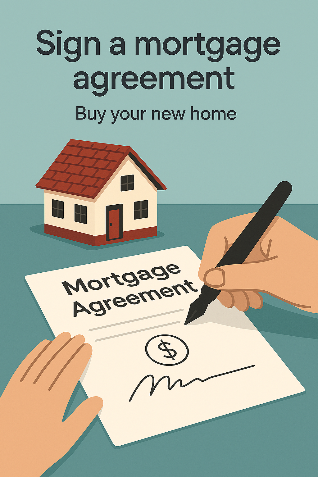/Collection: /by davooda/Type: PNG/A visually engaging illustration depicting the act of signing a mortgage agreement with a house in the background, ideal for real estate marketing or financial services.