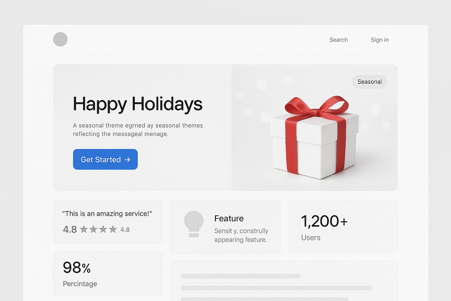 A sleek landing page design featuring a holiday gift box, small fonts, and a clean layout. The design integrates seasonal themes with a professional aesthetic.