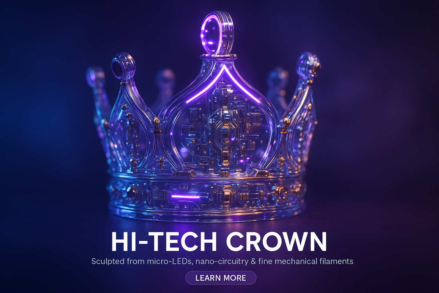 A hyperrealistic 3D crown showcasing intricate details, crafted from transparent materials and embedded with glowing micro-LEDs. The crown reflects light beautifully, creating a stunning visual effect.