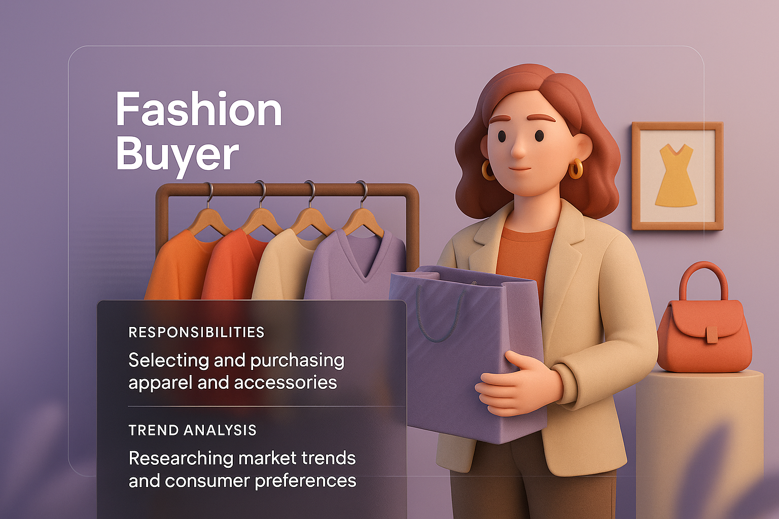 A modern web page design featuring a 3D illustration of a fashion buyer, showcasing responsibilities and trend analysis in a visually appealing layout.