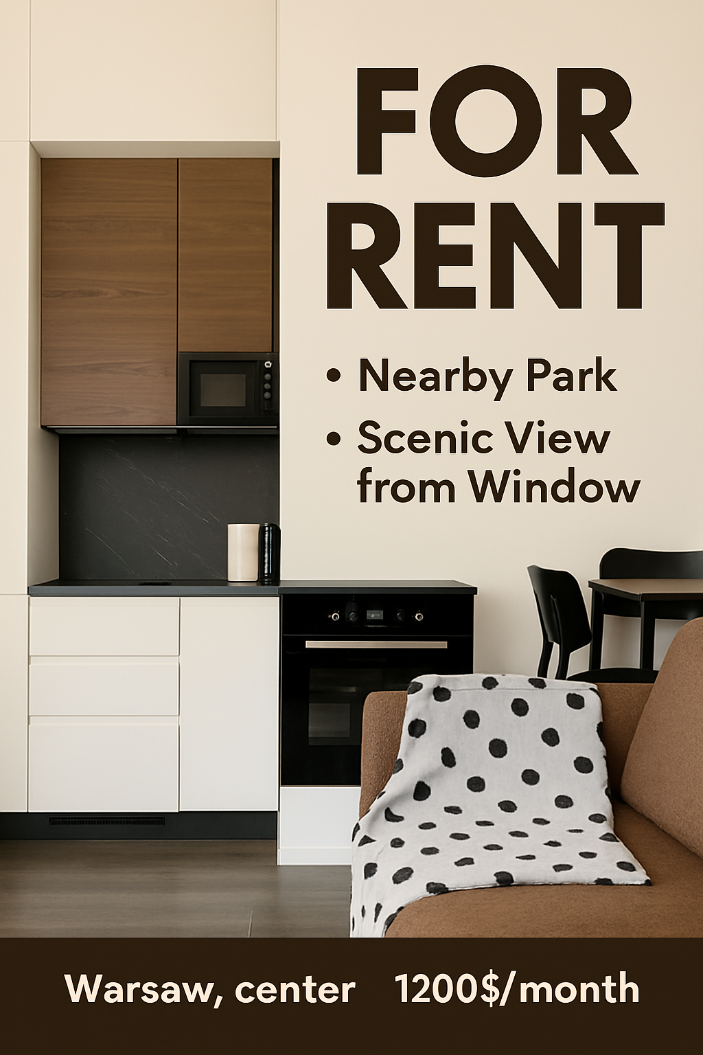 /Collection: /by Sergey Leonov/Type: PNG/Modern real estate advertisement showcasing a rental apartment in Warsaw, featuring a clean design with emphasis on amenities and location. Suitable for online property listings.