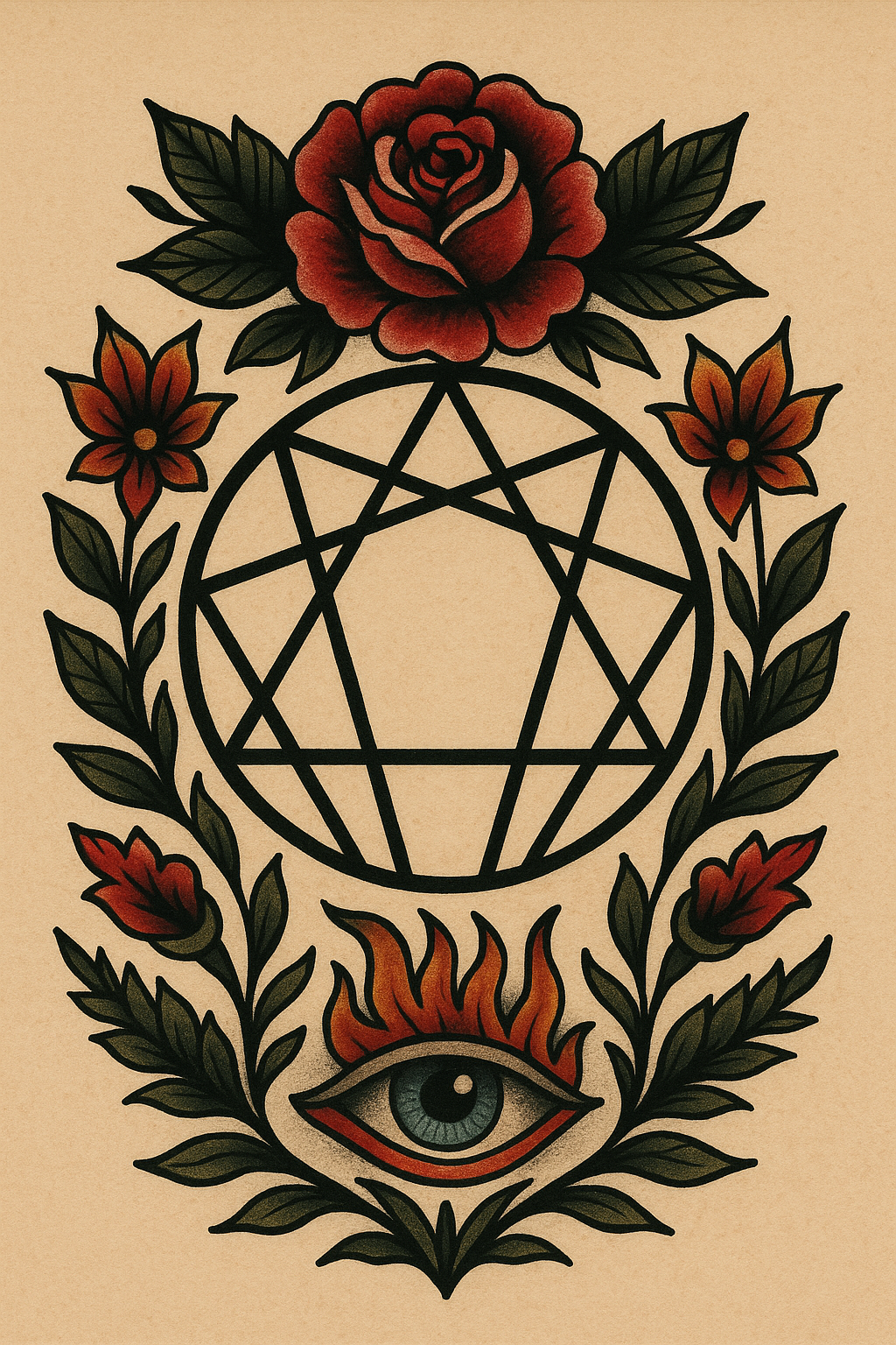 /Collection: /by davooda/Type: PNG/This is a tattoo-inspired illustration featuring an eye, flowers, and geometric shapes. The visual style is bold and colorful, suitable for art enthusiasts and tattoo lovers.