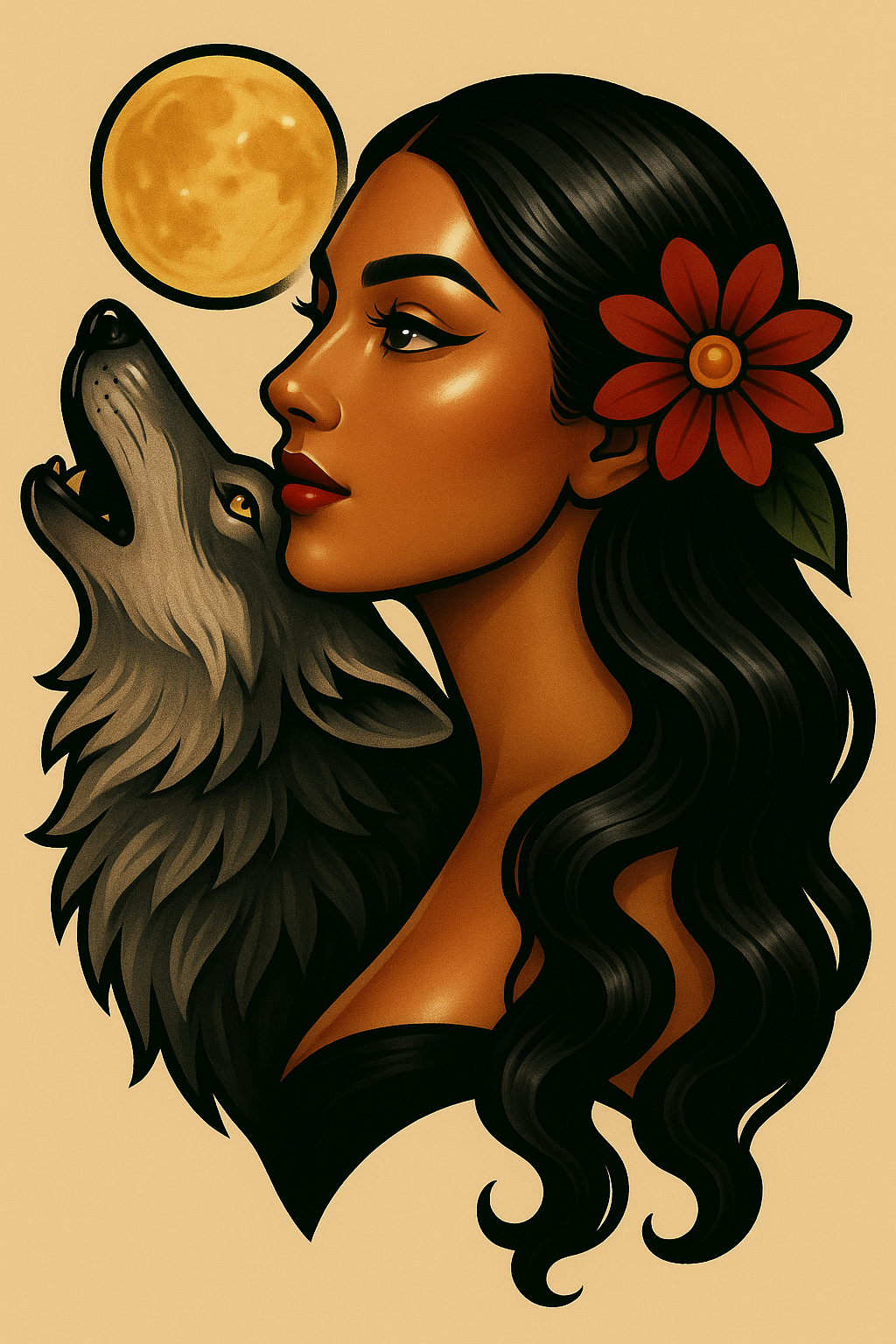 /Collection: /by davooda/Type: PNG/A striking illustration featuring a woman with long, flowing hair and a wolf beside her, gazing at a large moon. The composition blends tattoo aesthetics with a glossy, anime-inspired finish.