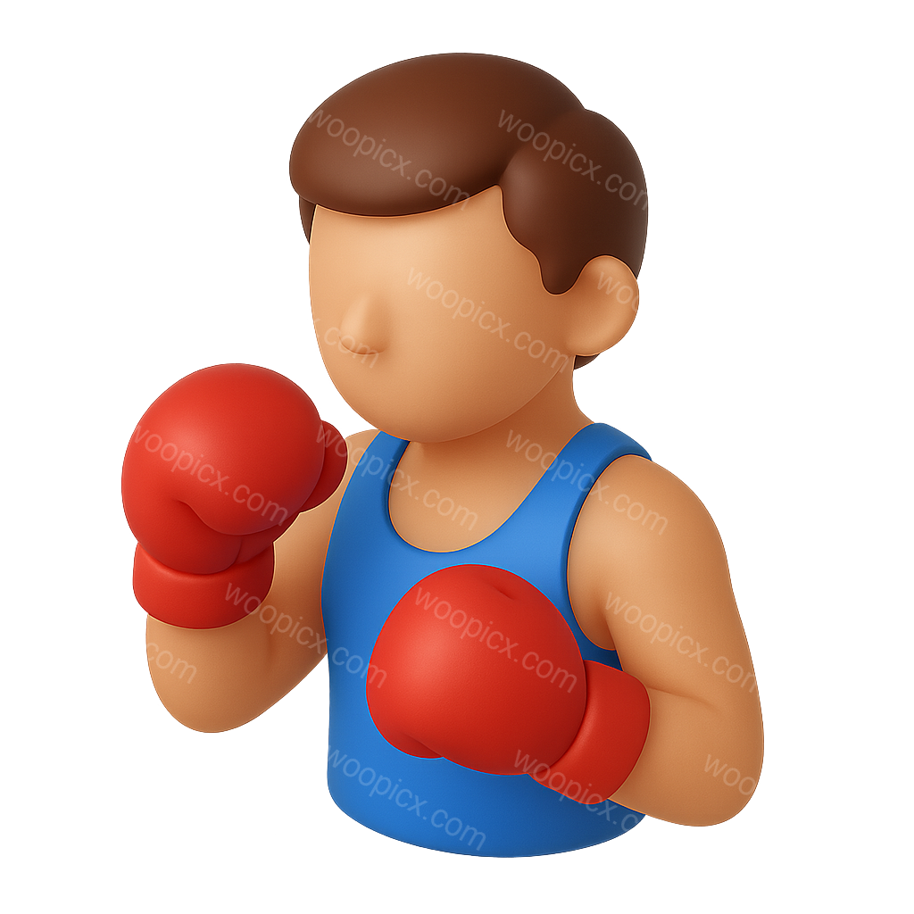 A simple, stylized 3D icon of a boxer in a three-quarter view. The character wears a blue tank top and red boxing gloves, showcasing a volumetric and isometric design.