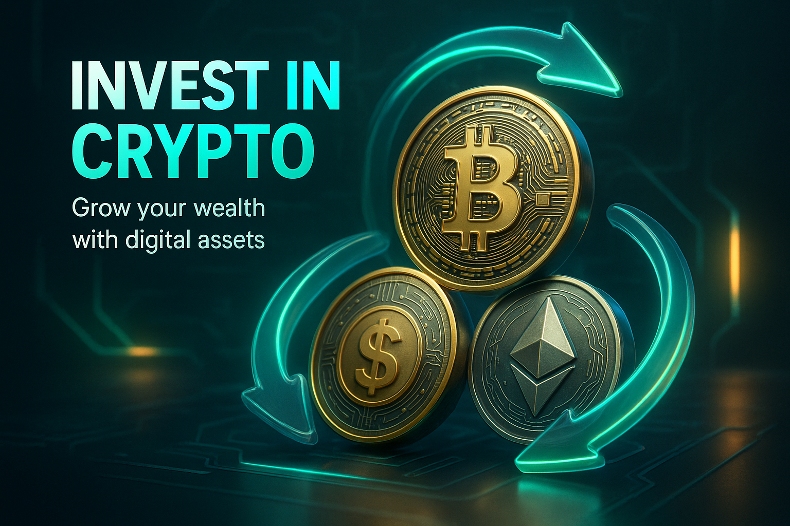 Digital Asset Investment Graphic Featuring Cryptocurrency Symbols