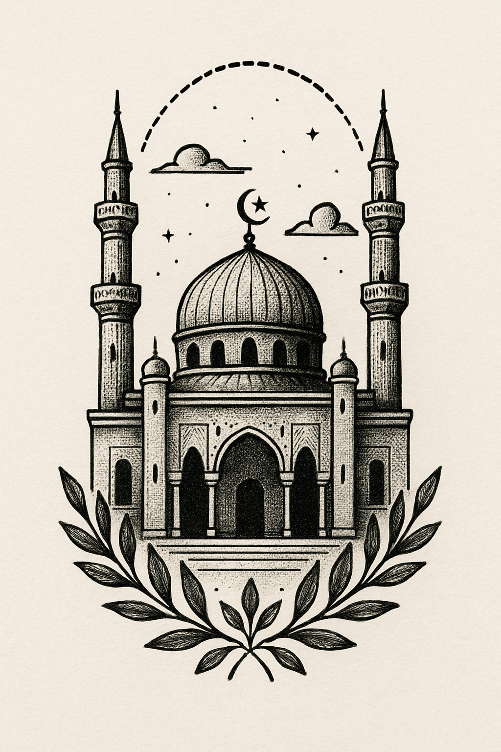 Intricate Line Art of a Mosque with Star and Crescent