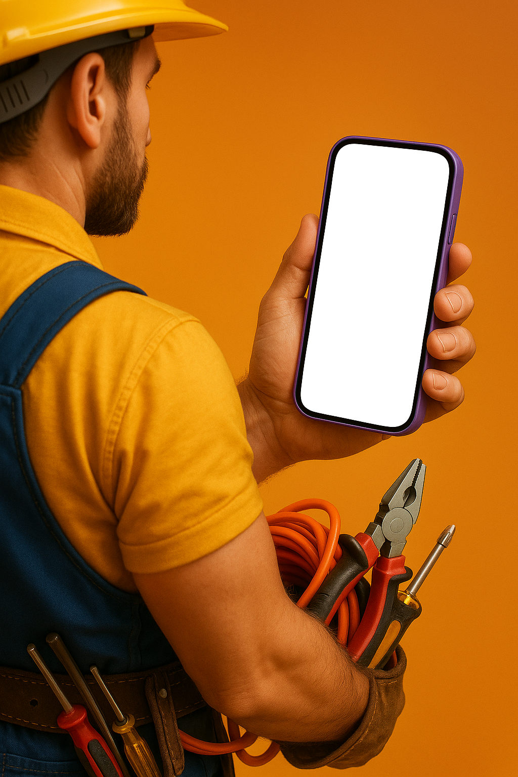 Electrician Holding Purple Phone Against Orange Background