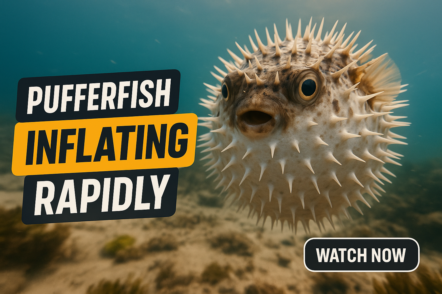 Engaging thumbnail for an underwater video showcasing a pufferfish inflating rapidly, designed to attract viewers with vibrant imagery and bold typography.