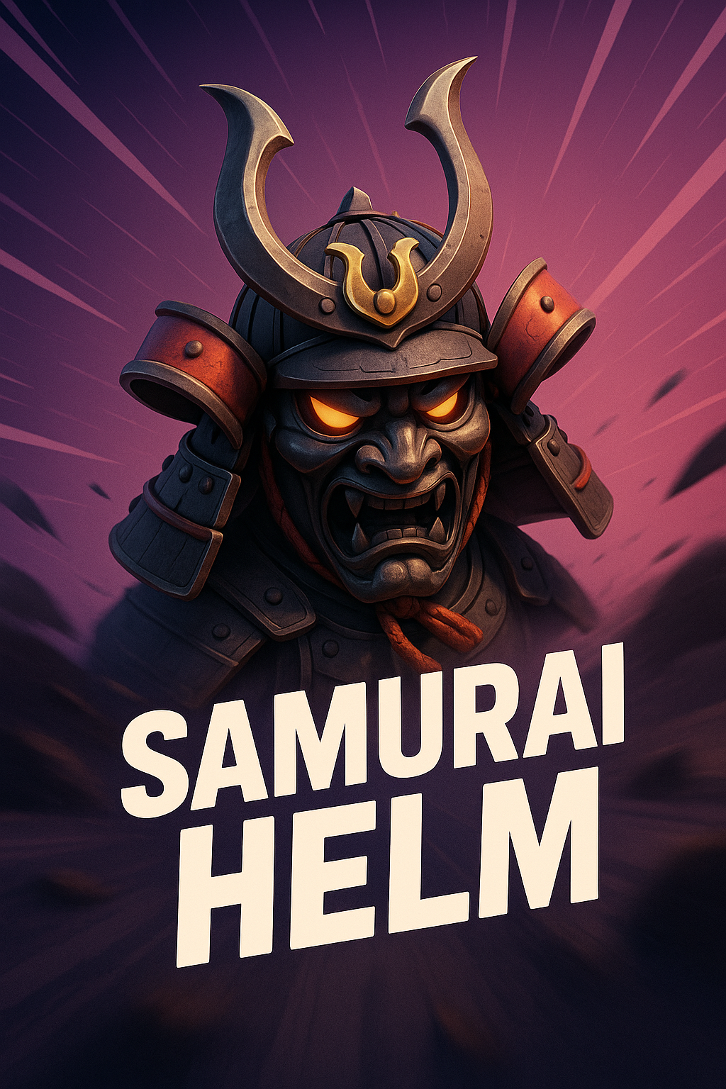 Dynamic Samurai Helm with Bold Typography and Vivid Colors