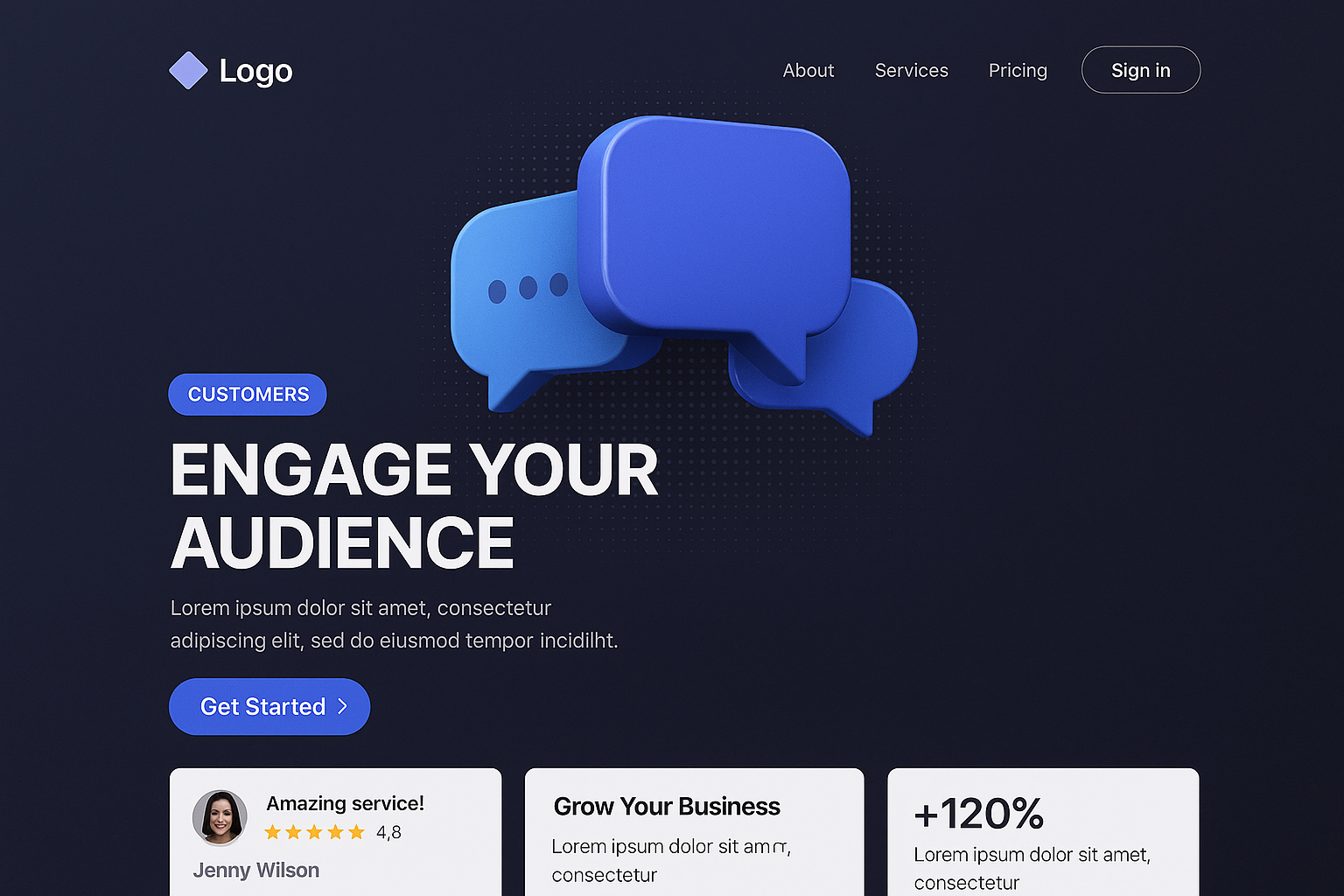 A sleek landing page design featuring a bold 3D object with speech bubbles against a dark gradient background. Includes a prominent headline and marketing blocks.