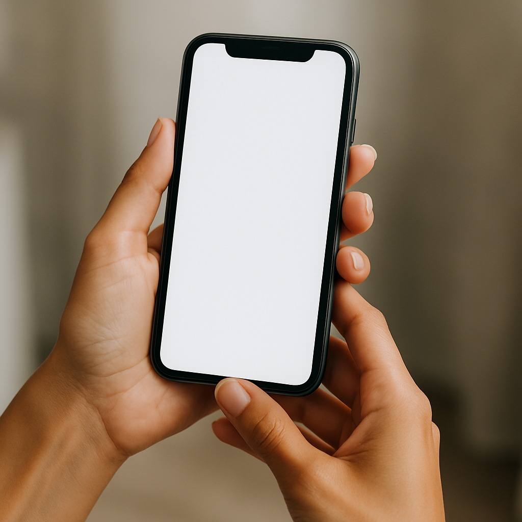 /Collection: /by davooda/Type: PNG/A clean smartphone mockup held in hands, featuring a blank screen ideal for showcasing app designs or marketing graphics. The minimalist background enhances focus on the device, making it suitable for digital presentations.