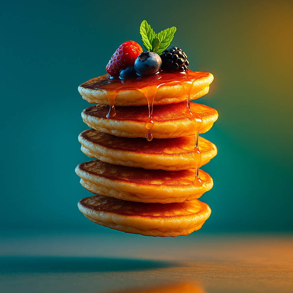 A beautifully lit stack of pancakes suspended in mid-air, topped with fresh berries and syrup. The vibrant background features a smooth gradient, enhancing the realism and dynamic feel of the scene.