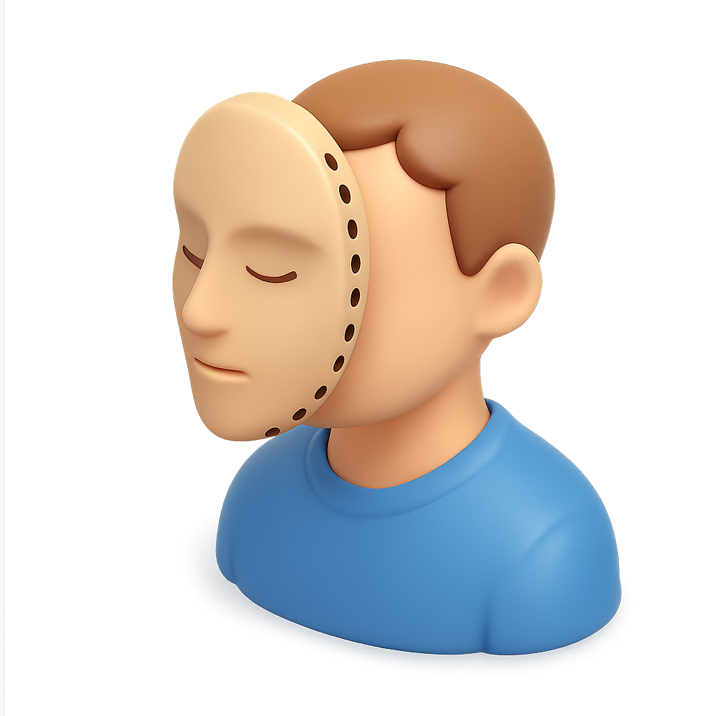 A 3D stylized icon featuring a person with a half-mask design, showcasing a smooth texture and a neutral expression. The character wears a blue shirt and has short brown hair.
