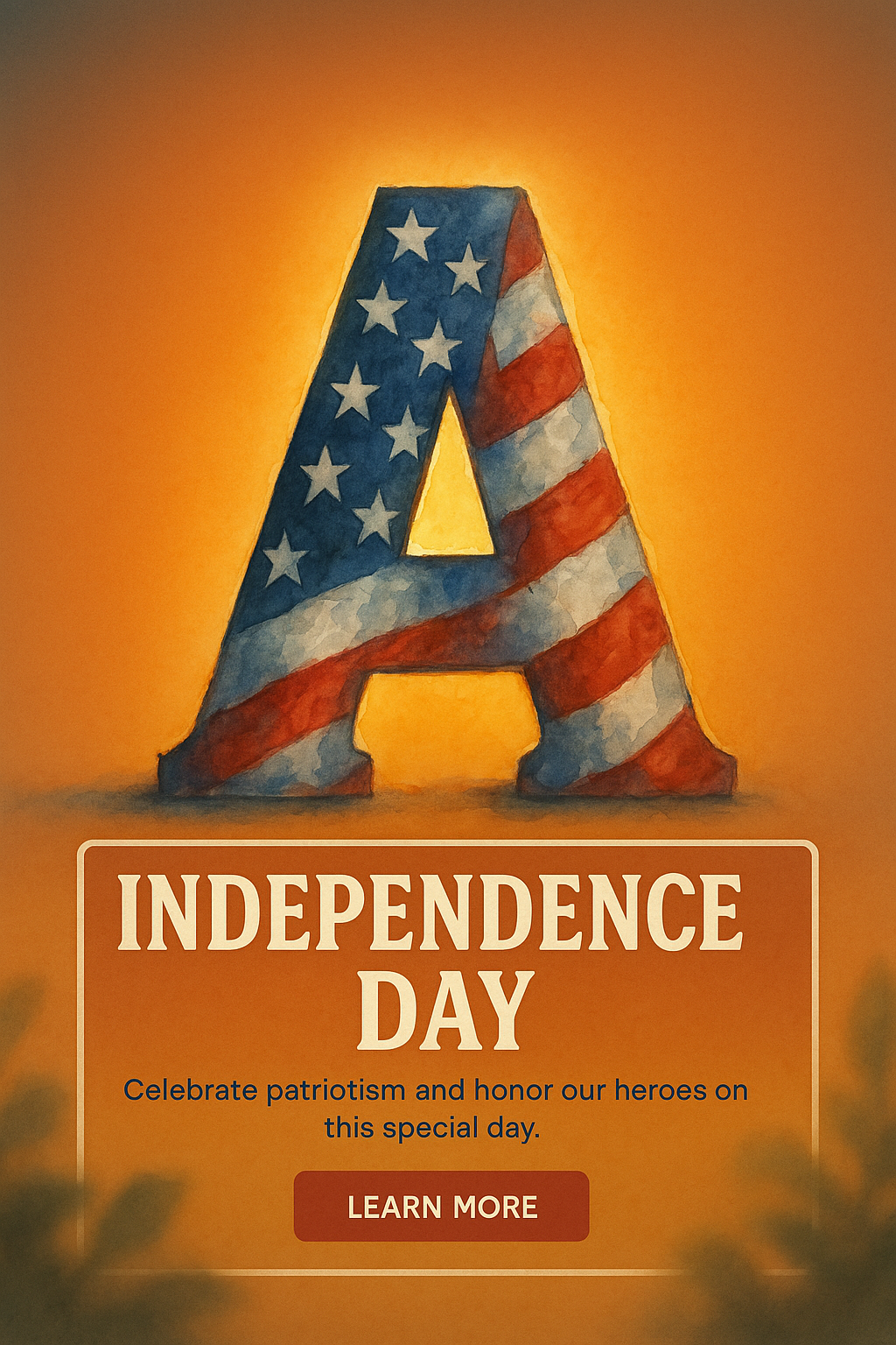 /Collection: /by davooda/Type: PNG/A visually appealing graphic promoting Independence Day, featuring a large letter 'A' adorned with the American flag. Ideal for social media or event promotion.