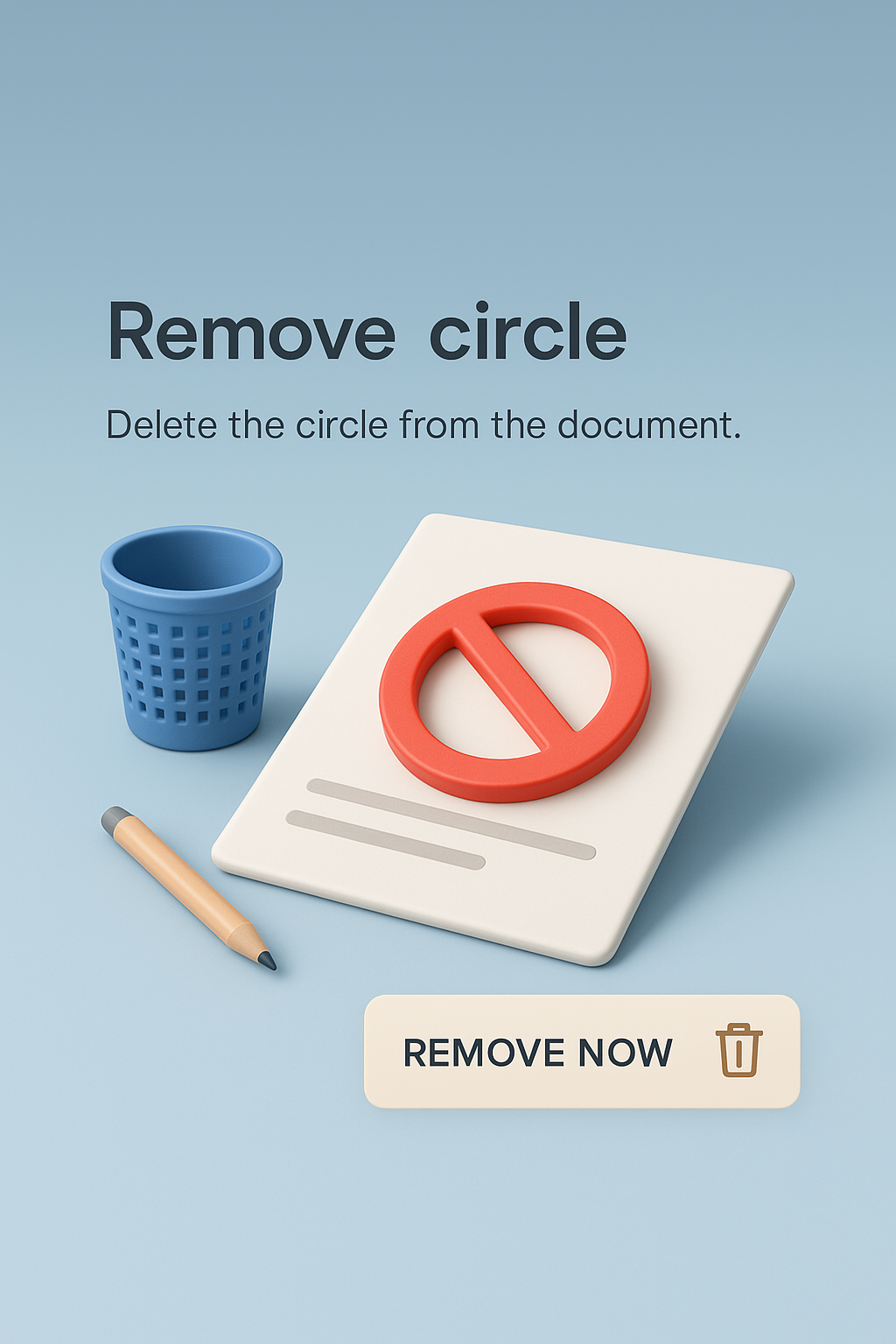 /Collection: /by davooda/Type: PNG/A zoomed-out, realistic 3D illustration depicting a document with a 'Remove Circle' action. Features include a blue trash bin, pencil, and an action button, all set against a smooth gradient background.