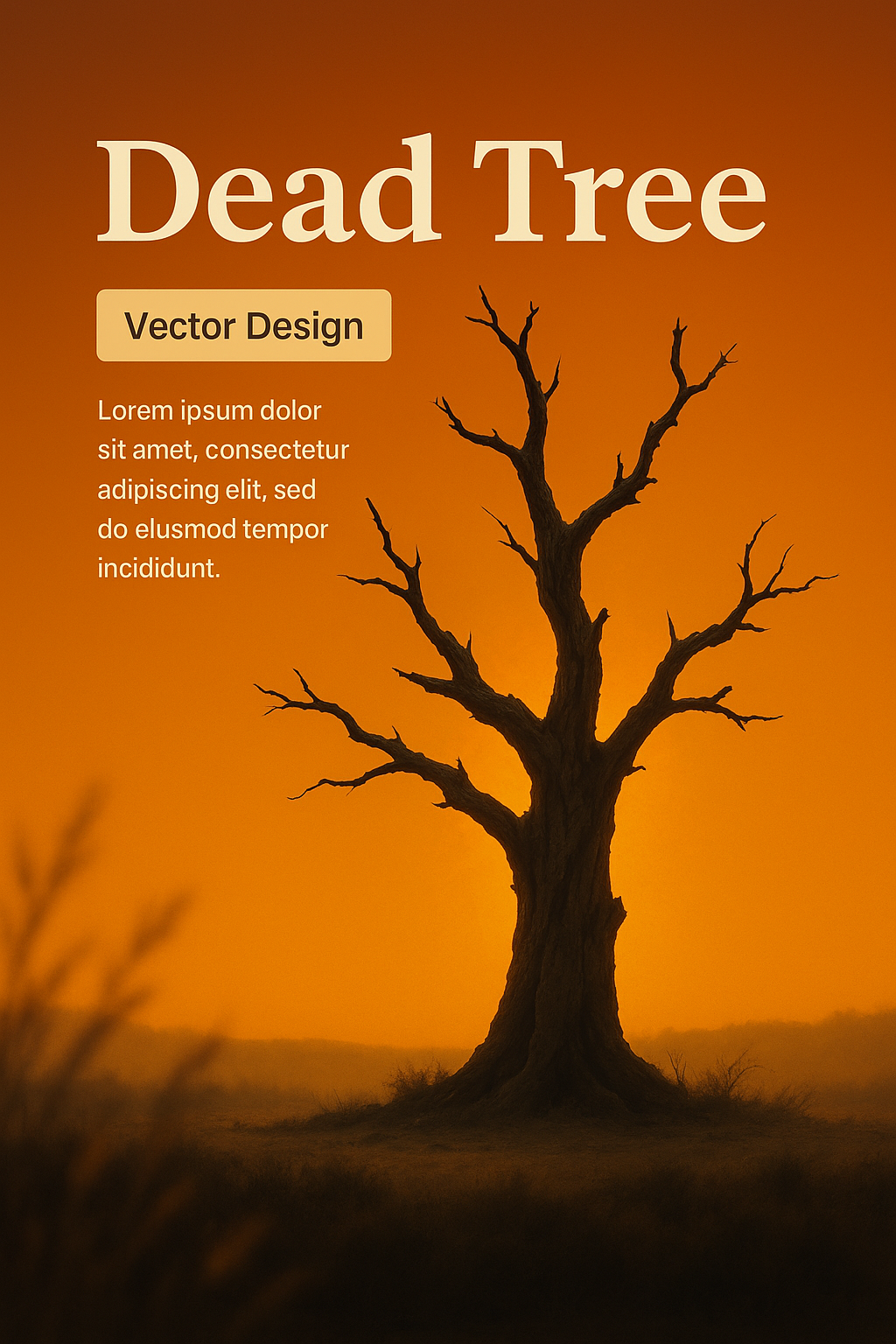 This image features a stylized vector design of a dead tree against a warm sunset background. It's suited for nature-themed graphics or design projects.