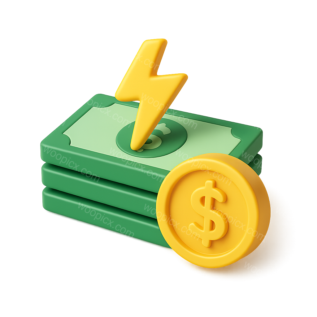 /Premium/Collection: /by davooda/Type: PNG/A visually striking 3D icon depicting stacks of green currency with a yellow lightning bolt above and a golden dollar coin, symbolizing the concept of flash loans.