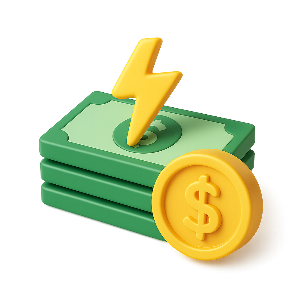 /Collection: /by davooda/Type: PNG/A visually striking 3D icon depicting stacks of green currency with a yellow lightning bolt above and a golden dollar coin, symbolizing the concept of flash loans.