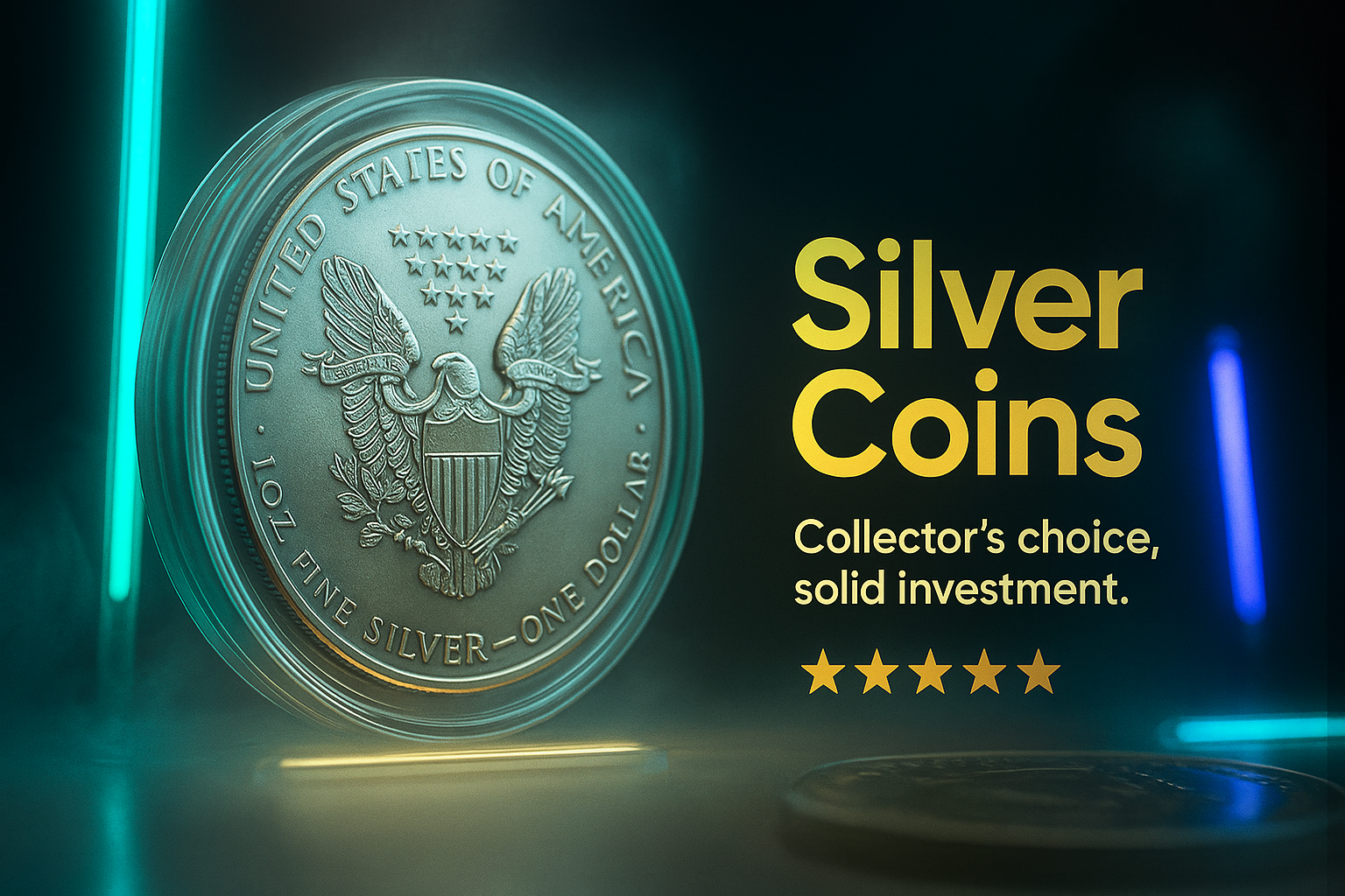 /Collection: /by davooda/Type: PNG/A sophisticated carousel slide featuring a detailed silver coin with glowing neon accents. The design includes promotional text highlighting its value as a solid investment.