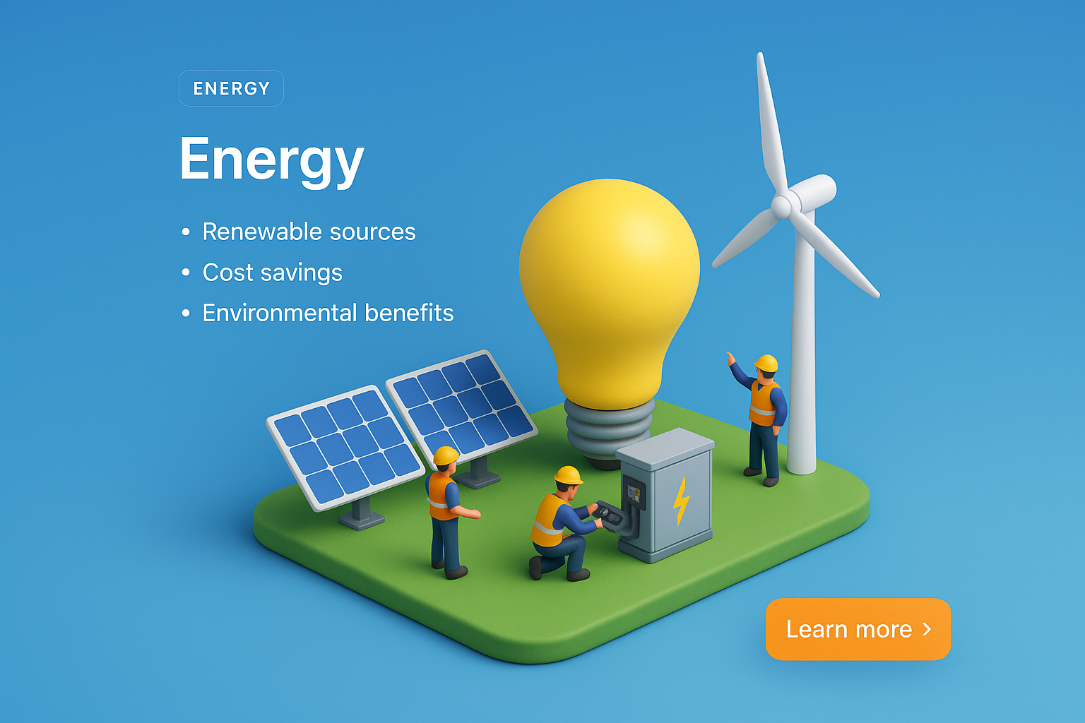 /Collection: /by davooda/Type: PNG/A vibrant 3D scene illustrating energy concepts, featuring tiny figures interacting with solar panels, a light bulb, and a wind turbine, all set against a smooth gradient background.
