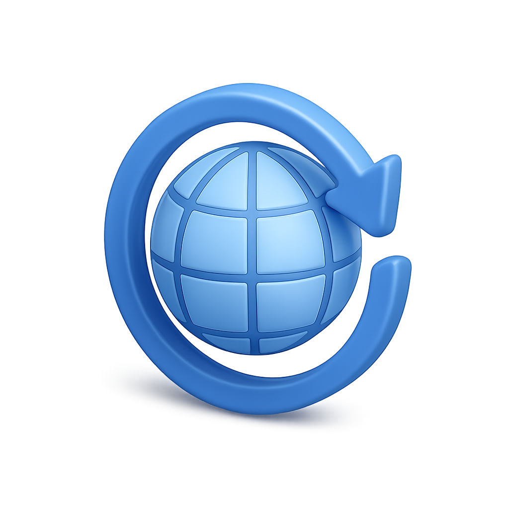A visually striking 3D icon featuring a circular arrow encircling a globe. The design is rendered with a transparent background and showcases a three-quarter isometric view, enhancing its volumetric appeal.