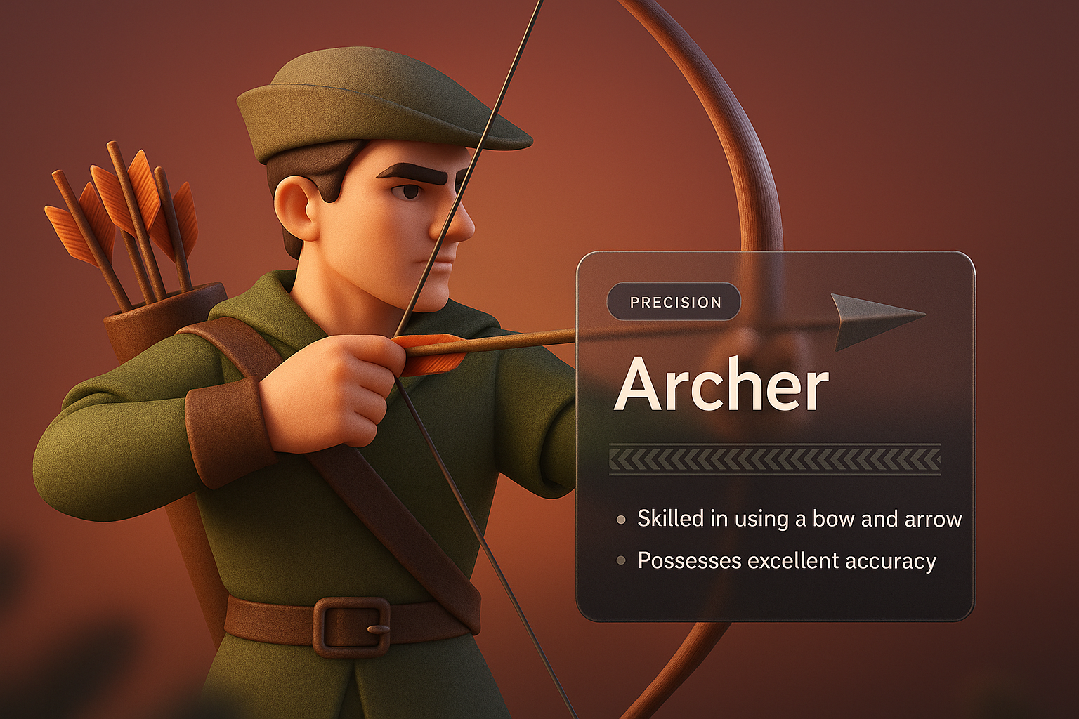 A detailed 3D illustration of an archer, showcasing precision and skill. The design features integrated text elements on a gradient background, enhancing the visual appeal.
