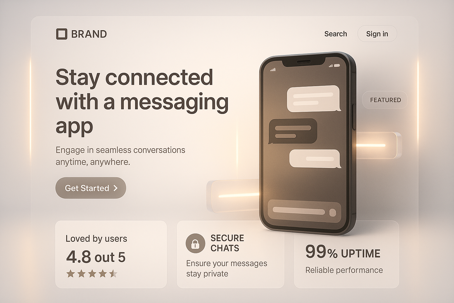 A sleek landing page design for a messaging app featuring a smartphone, user ratings, and action buttons. Includes a clean layout with neon accents.