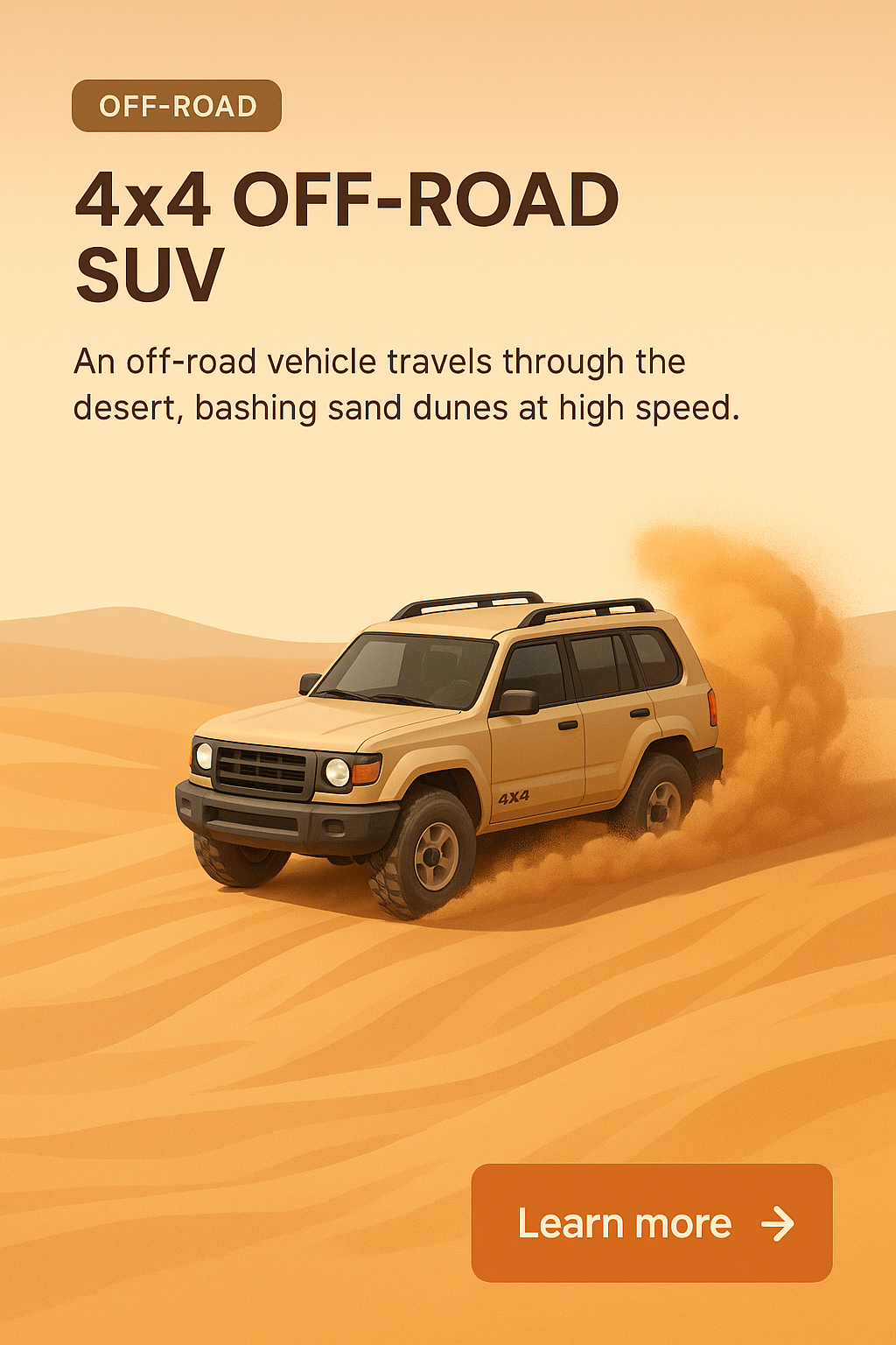 A detailed 3D illustration of a 4x4 off-road SUV speeding through sandy dunes in a desert environment, with a smooth gradient background and clear text.