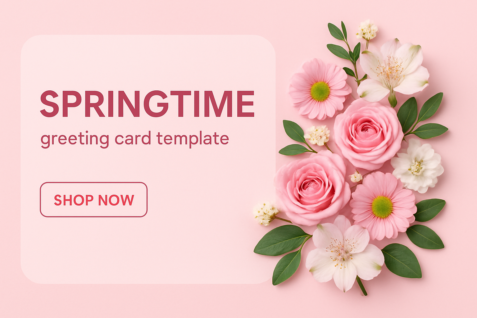 A vibrant spring-themed greeting card banner featuring pink flowers on a light pink background. The layout includes bold typography and a call-to-action button.