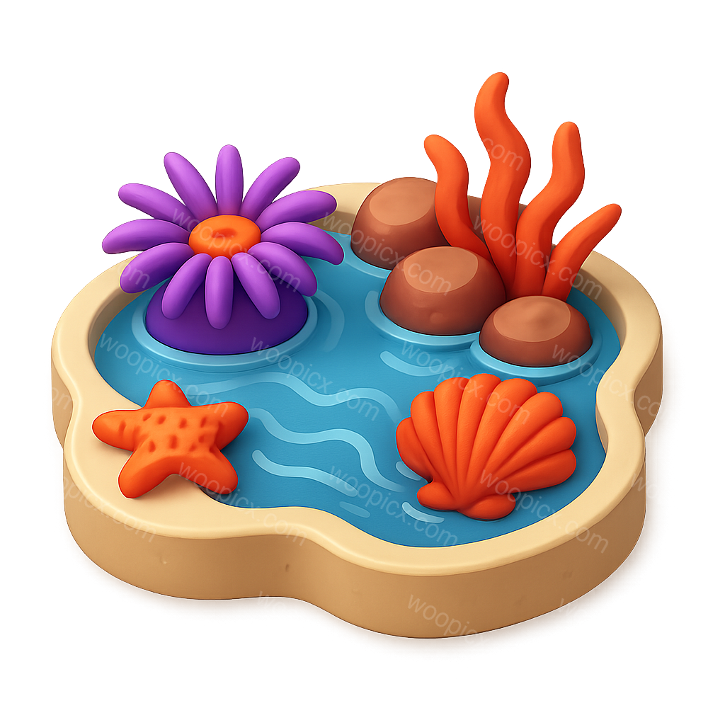/Premium/Collection: /by davooda/Type: PNG/This image features a vibrant isometric tide pool scene, showcasing colorful sea life like a starfish, seashell, and coral, all set in a stylized, three-dimensional design.