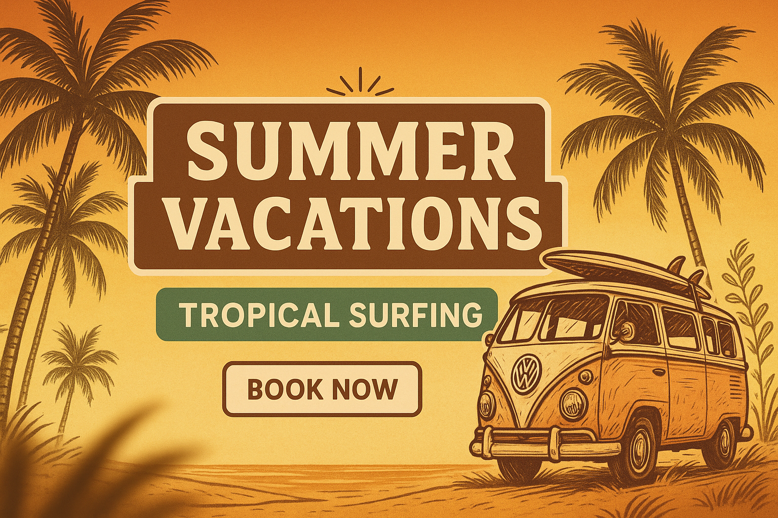 Vibrant promotional graphic for summer vacations featuring a vintage van, palm trees, and a surfing theme, ideal for travel marketing.