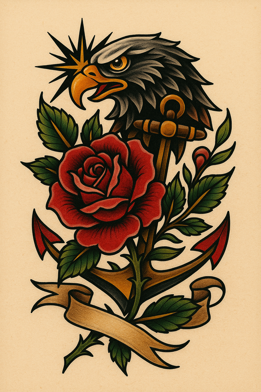 Colorful Traditional Tattoo Design Featuring Eagle and Rose