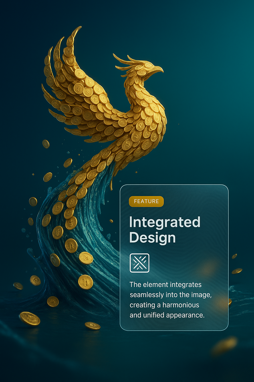 A striking 3D illustration of a phoenix rising in a wave of gold coins. The design features integrated text and graphics, enhancing the dynamic composition.
