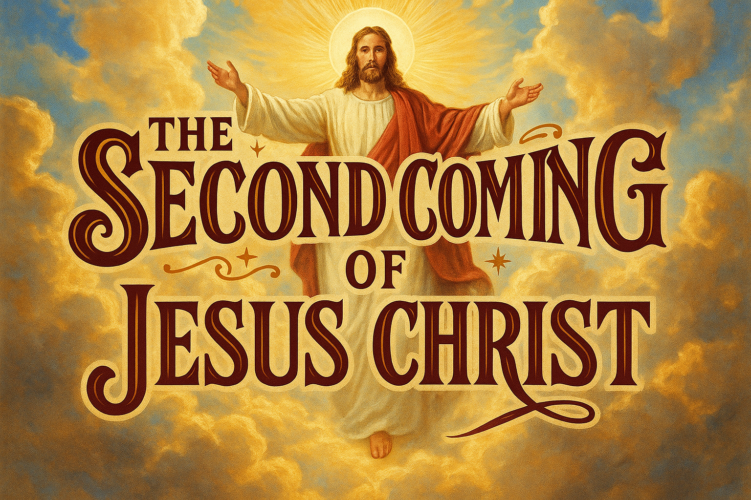 /Collection: /by davooda/Type: PNG/A religious-themed graphic illustrating the Second Coming of Jesus Christ, featuring vibrant colors and dramatic cloud formations, suitable for faith-based publications or presentations.