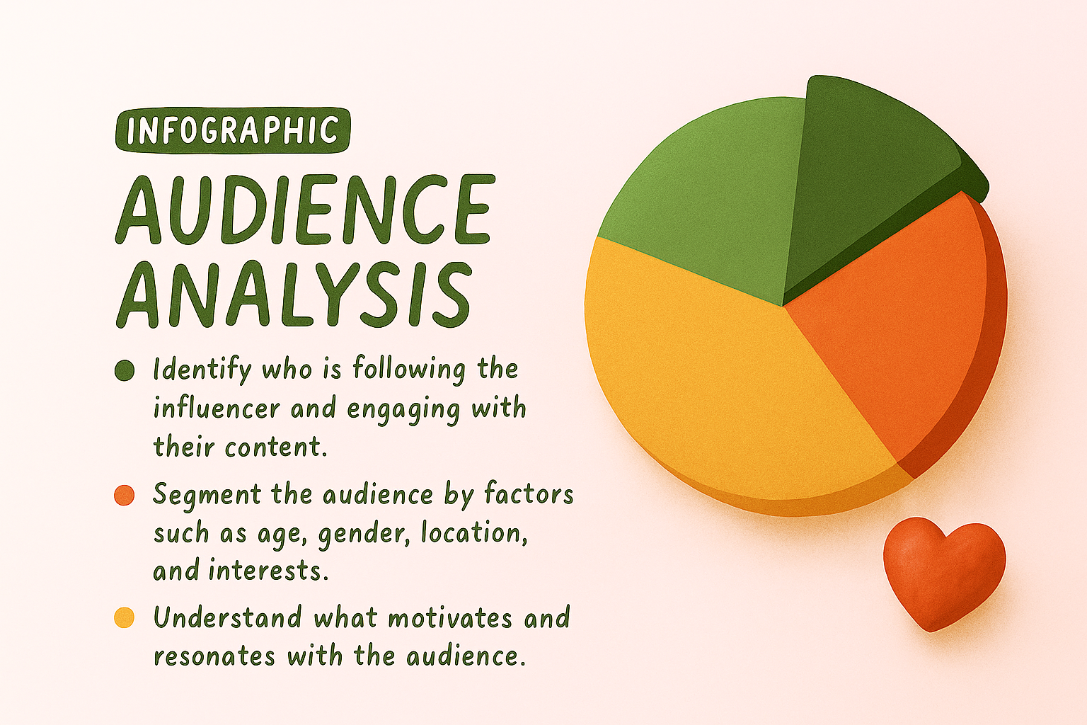 /Collection: /by davooda/Type: PNG/Colorful infographic illustrating audience analysis for influencers. It highlights key factors like age, gender, and interests, aimed at marketers and content creators.