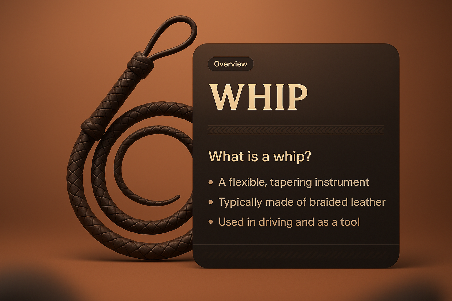 A detailed 3D illustration of a whip, featuring a sleek design and informative overlay. The background is a smooth gradient, enhancing the visual appeal.