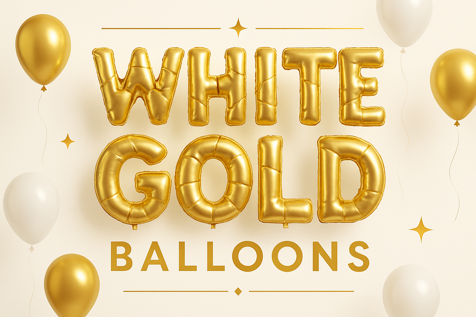 Vibrant graphic featuring gold and white balloons with playful text, ideal for party invitations or event promotions. The modern design appeals to celebration themes.