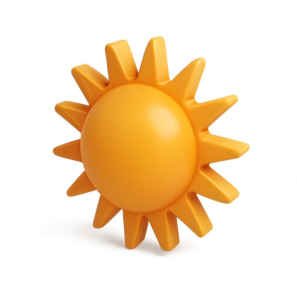 A vibrant 3D sun icon featuring a shiny yellow sphere and pointed rays, presented in an isometric view with a transparent background, showcasing a volumetric design.