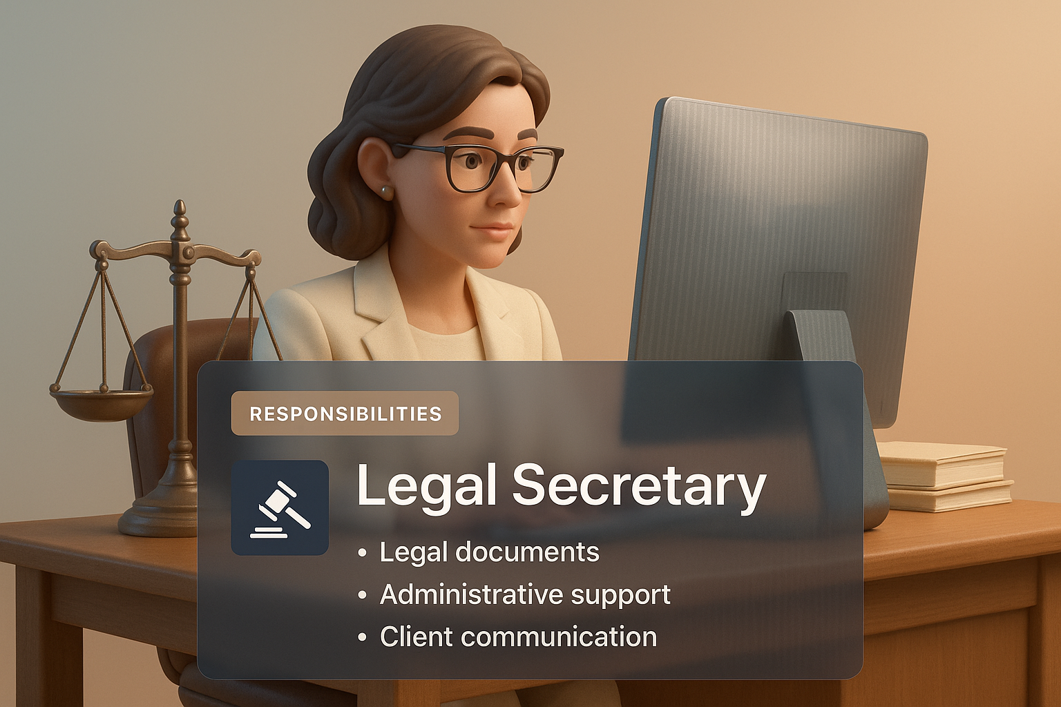 /Collection: /by davooda/Type: PNG/3D illustration of a legal secretary at a desk with a computer. The design features a light background, integrated info blocks, and clear text highlighting responsibilities.