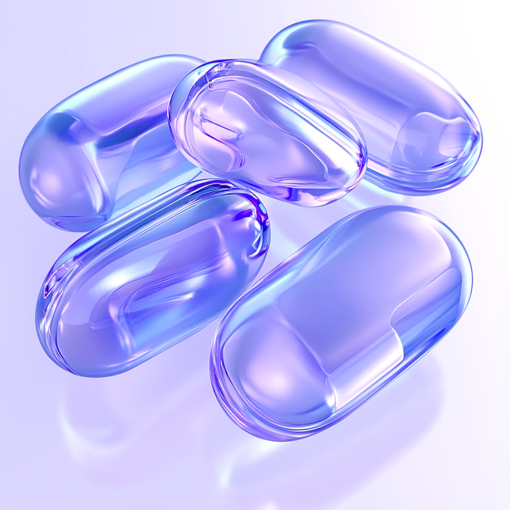 Stylized rendering of translucent gel capsules featuring a smooth, glossy finish and soft purple hues, ideal for pharmaceutical or cosmetic product presentations.