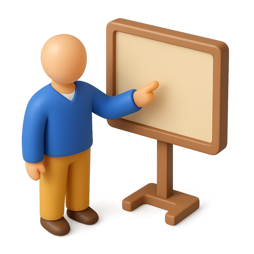 3D Teaching Icon with a Figure Pointing at a Board