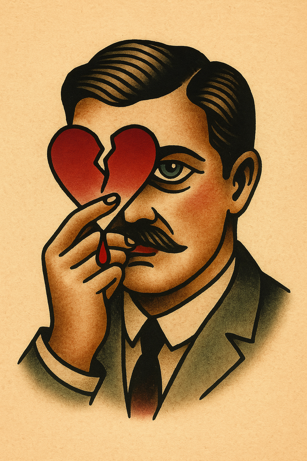 A colorful tattoo sketch featuring a man holding a broken heart in front of his eye, set on a light beige background, symbolizing emotional depth.