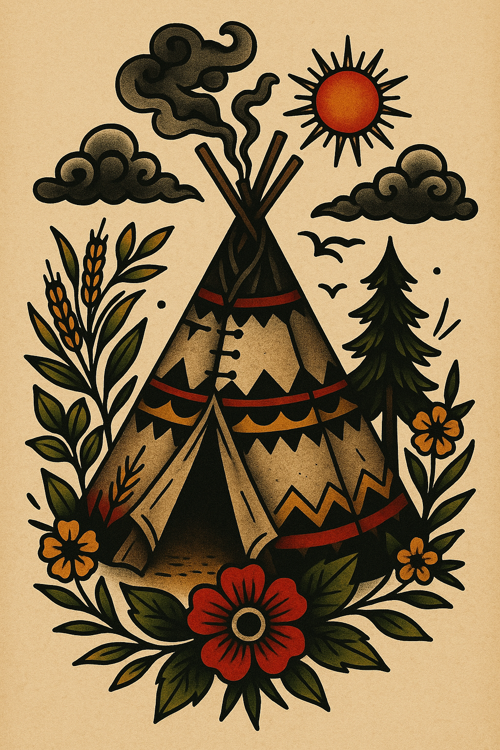 This image features a vibrant illustration of a teepee encircled by floral and natural elements. It has a folk art style suitable for decorative purposes.